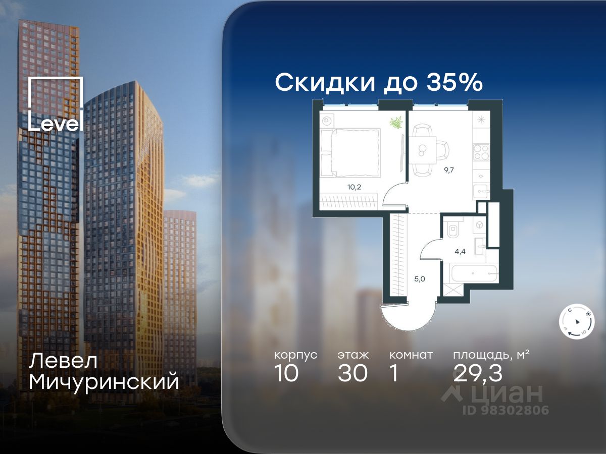 В жилом квартале, расположенном на границе с природным заказником "Долина реки Очаковки", продаётся 1-комнатная квартира площадью 29.30 кв.м с отделкой white box. Квартира расположена на 30 этаже 42-этажного корпуса 10 в жилом комплексе бизнес-класса Левел Мичуринский (компания Level Group/Левел групп).