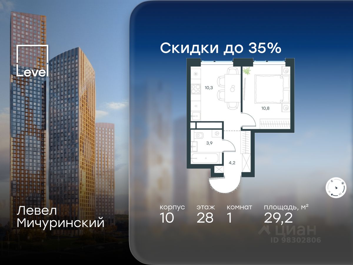 В жилом квартале, расположенном на границе с природным заказником "Долина реки Очаковки", продаётся 1-комнатная квартира площадью 29.20 кв.м с отделкой white box. Квартира расположена на 28 этаже 42-этажного корпуса 10 в жилом комплексе бизнес-класса Левел Мичуринский (компания Level Group/Левел групп).