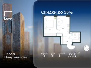 В жилом квартале, расположенном на границе с природным заказником "Долина реки Очаковки", продаётся 1-комнатная квартира площадью 33.80 кв.м с отделкой white box. Квартира расположена на 31 этаже 42-этажного корпуса 10 в жилом комплексе бизнес-класса Левел Мичуринский (компания Level Group/Левел групп).