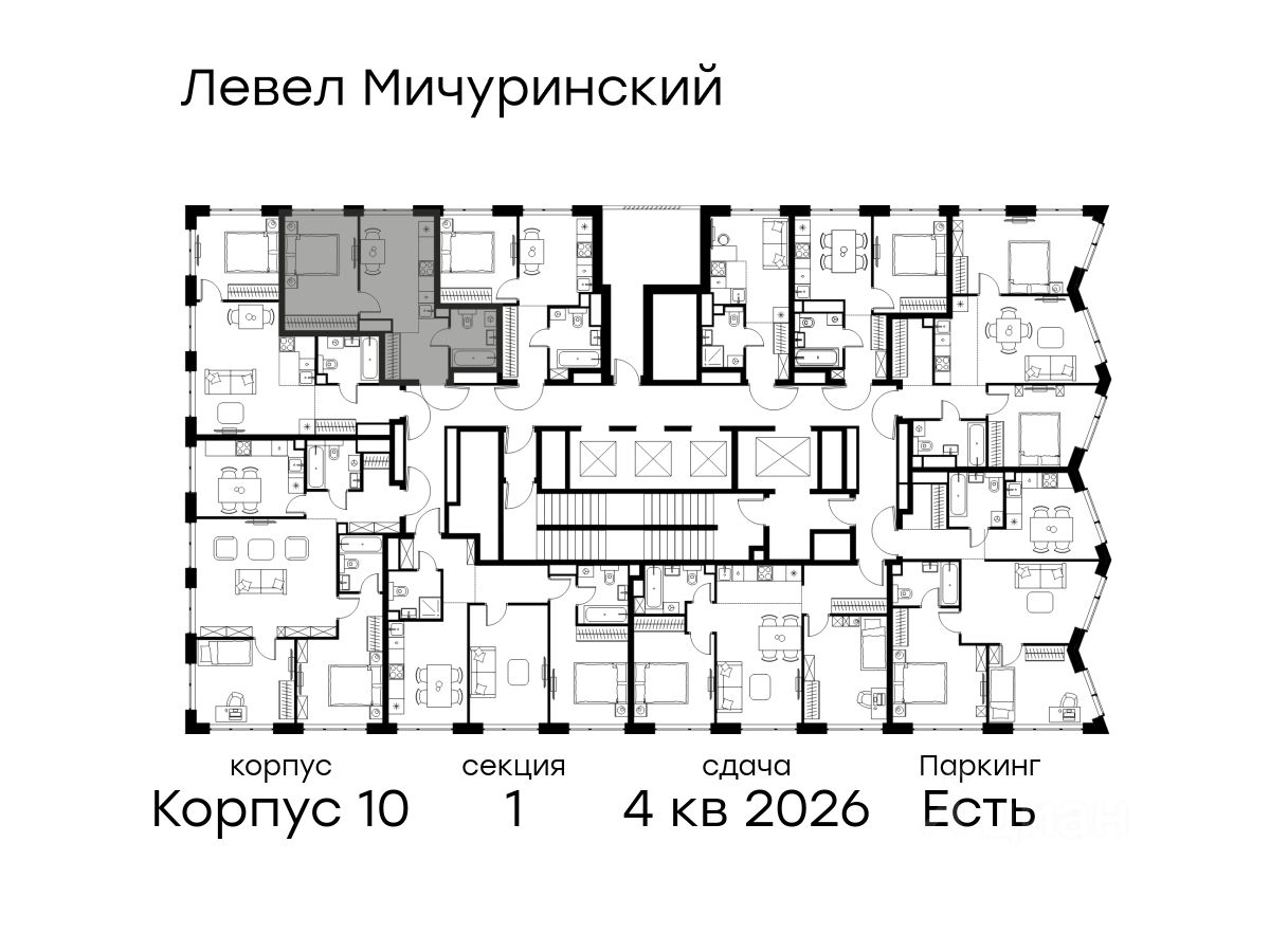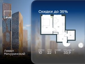 В жилом квартале, расположенном на границе с природным заказником "Долина реки Очаковки", продаётся 1-комнатная квартира площадью 33.90 кв.м с отделкой white box. Квартира расположена на 22 этаже 42-этажного корпуса 10 в жилом комплексе бизнес-класса Левел Мичуринский (компания Level Group/Левел групп).