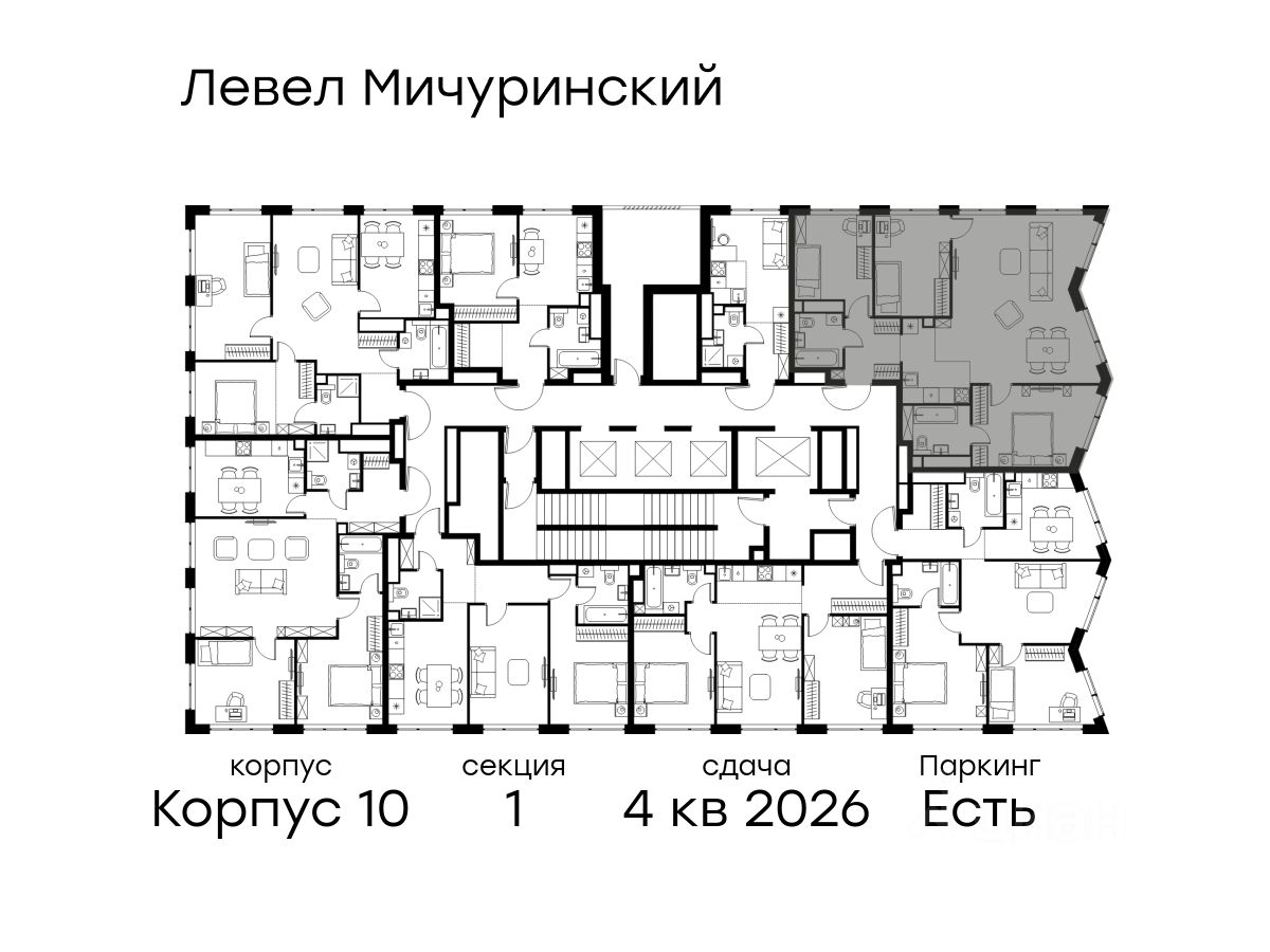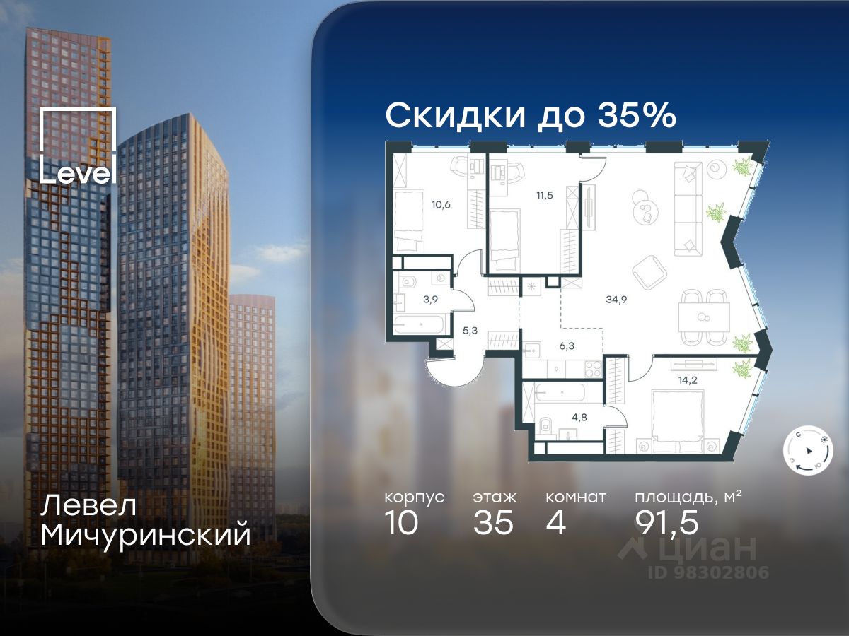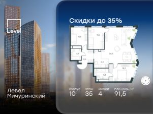 В жилом квартале, расположенном на границе с природным заказником "Долина реки Очаковки", продаётся 4-комнатная квартира площадью 91.50 кв.м с отделкой white box. Квартира расположена на 35 этаже 42-этажного корпуса 10 в жилом комплексе бизнес-класса Левел Мичуринский (компания Level Group/Левел групп).