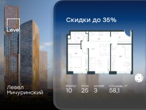 В жилом квартале, расположенном на границе с природным заказником "Долина реки Очаковки", продаётся 3-комнатная квартира площадью 58.10 кв.м с отделкой white box. Квартира расположена на 25 этаже 42-этажного корпуса 10 в жилом комплексе бизнес-класса Левел Мичуринский (компания Level Group/Левел групп).