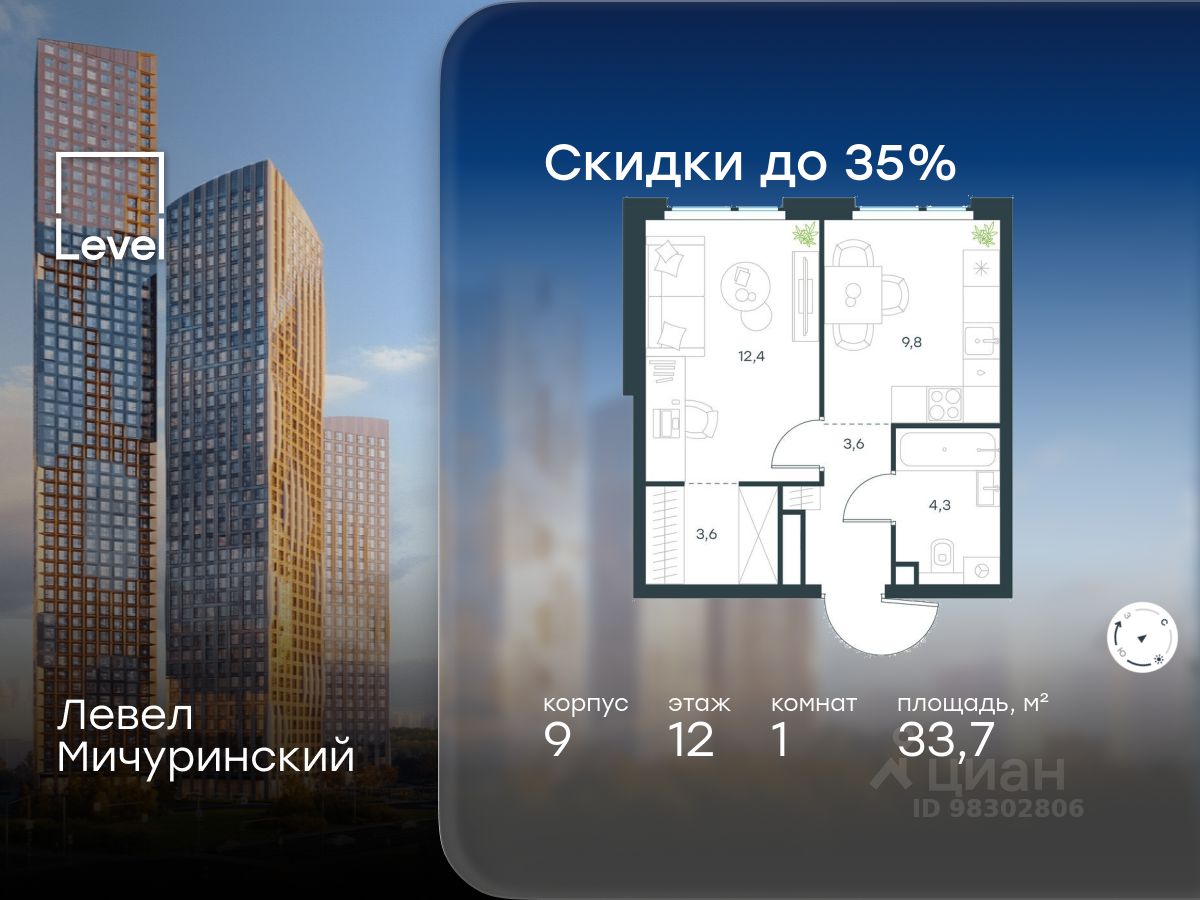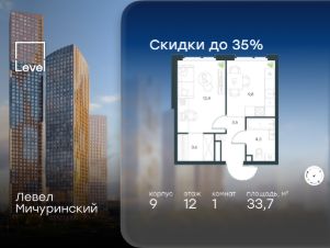 В жилом квартале, расположенном на границе с природным заказником "Долина реки Очаковки", продаётся 1-комнатная квартира площадью 33.70 кв.м без отделки. Квартира расположена на 12 этаже 12-этажного корпуса 9 в жилом комплексе бизнес-класса Левел Мичуринский (компания Level Group/Левел групп).