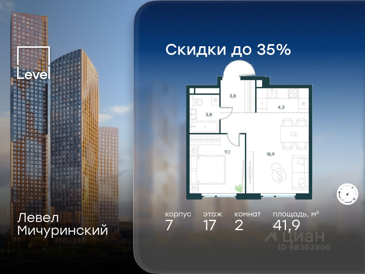 В жилом квартале, расположенном на границе с природным заказником "Долина реки Очаковки", продаётся 2-комнатная квартира площадью 41.90 кв.м без отделки. Квартира расположена на 17 этаже 24-этажного корпуса 7 в жилом комплексе бизнес-класса Левел Мичуринский (компания Level Group/Левел групп).