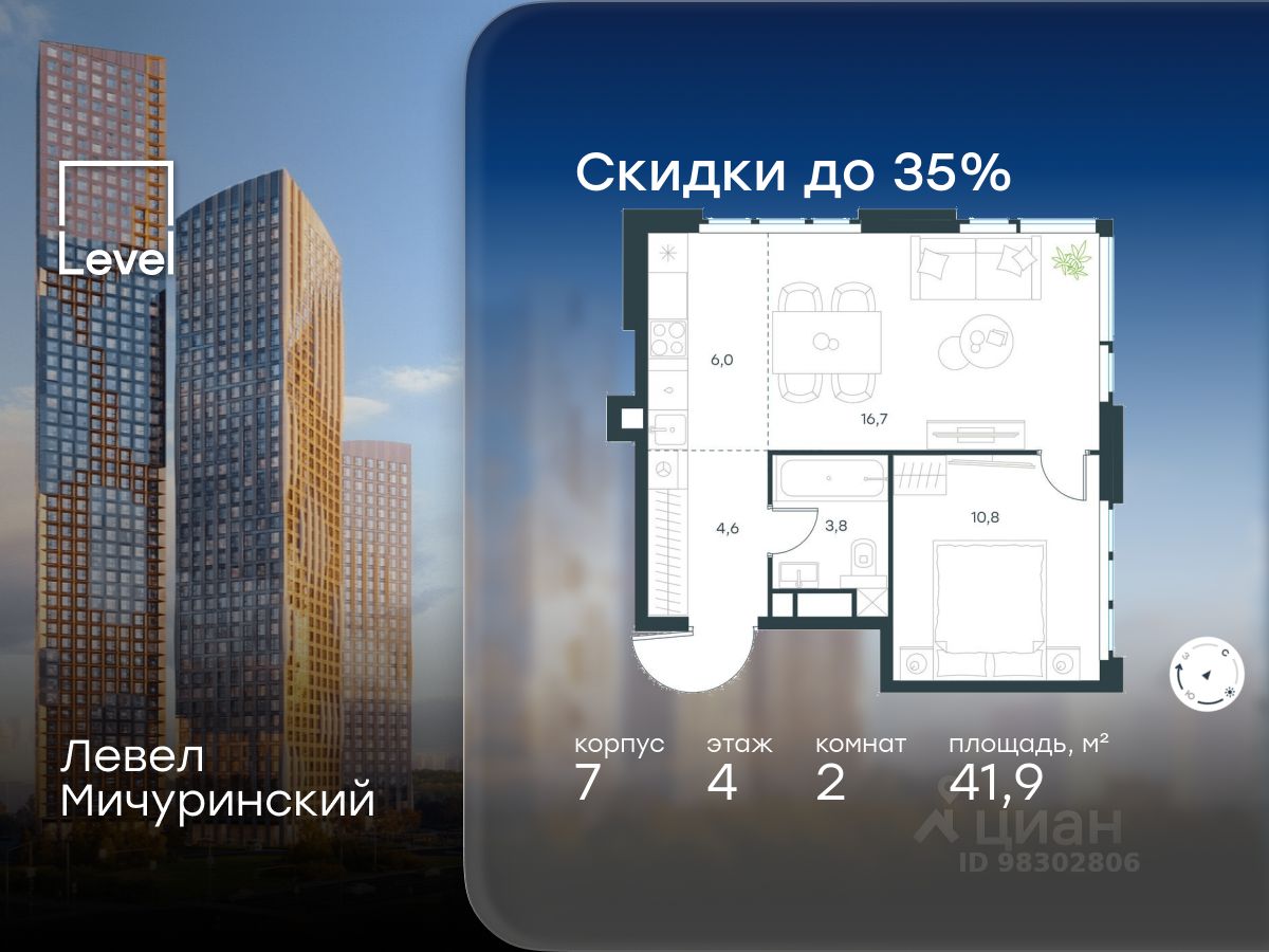 В жилом квартале, расположенном на границе с природным заказником "Долина реки Очаковки", продаётся 2-комнатная квартира площадью 41.90 кв.м без отделки. Квартира расположена на 4 этаже 24-этажного корпуса 7 в жилом комплексе бизнес-класса Левел Мичуринский (компания Level Group/Левел групп).