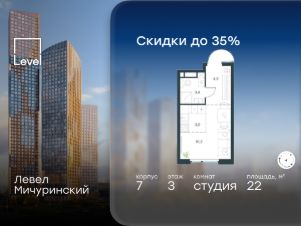 В жилом квартале, расположенном на границе с природным заказником "Долина реки Очаковки", продаётся студия площадью 22.00 кв.м без отделки. Квартира расположена на 3 этаже 24-этажного корпуса 7 в жилом комплексе бизнес-класса Левел Мичуринский (компания Level Group/Левел групп).