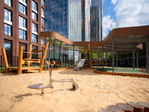 - 4,5 га благоустроенной территории с видовым мостом, уличным кинотеатром, зонами для тихого отдыха, работы, воркаута, площадки для петанка, футбола, настольного тенниса и пляжного волейбола.