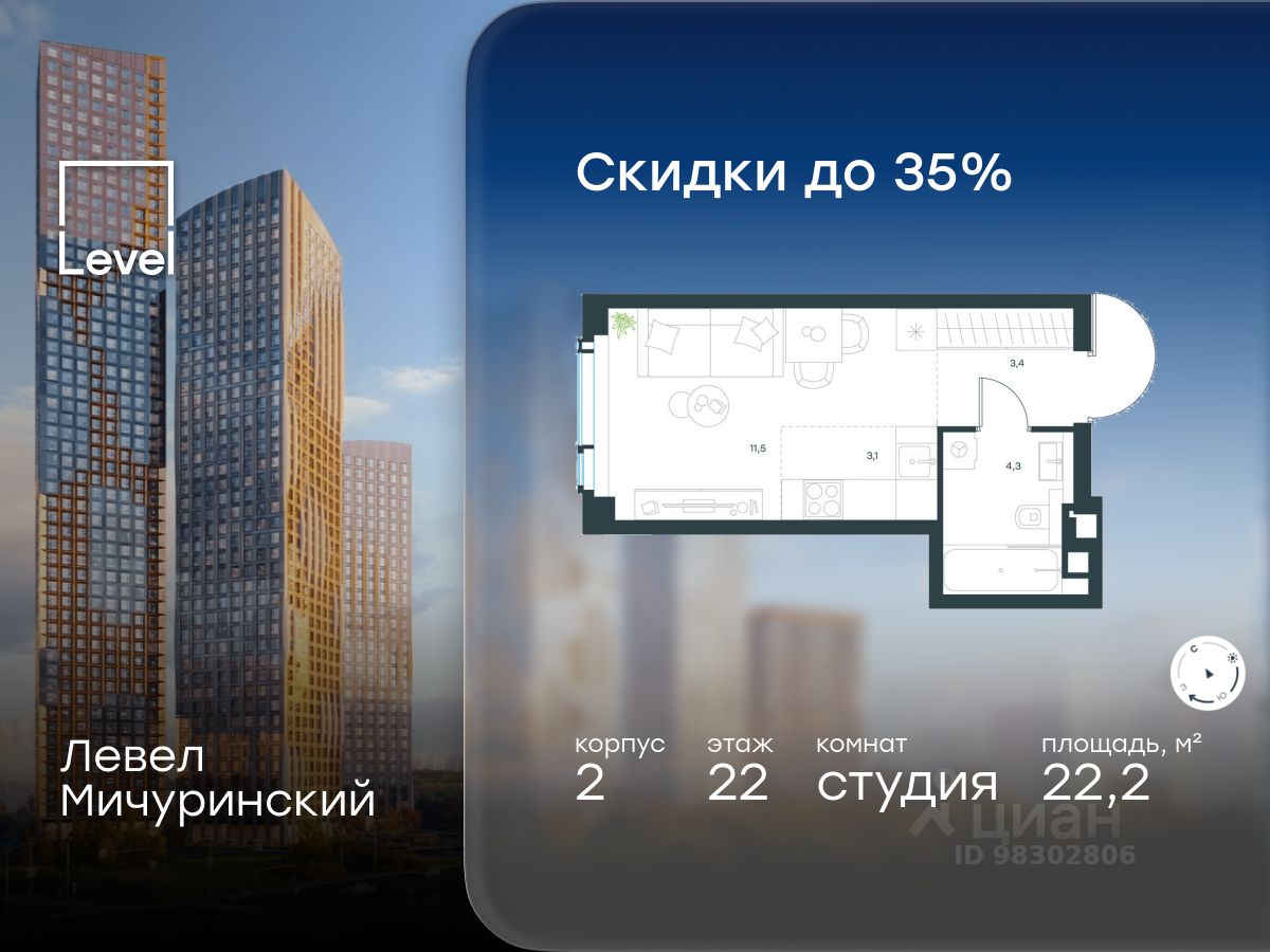 В жилом квартале, расположенном на границе с природным заказником "Долина реки Очаковки", продаётся студия площадью 22.20 кв.м без отделки. Квартира расположена на 22 этаже 42-этажного корпуса 2 в жилом комплексе бизнес-класса Левел Мичуринский (компания Level Group/Левел групп).