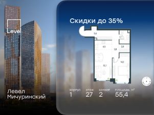 В жилом квартале, расположенном на границе с природным заказником "Долина реки Очаковки", продаётся 2-комнатная квартира площадью 55.40 кв.м без отделки. Квартира расположена на 27 этаже 54-этажного корпуса 1 в жилом комплексе бизнес-класса Левел Мичуринский (компания Level Group/Левел групп).