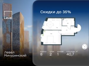 В жилом квартале, расположенном на границе с природным заказником "Долина реки Очаковки", продаётся 1-комнатная квартира площадью 40.70 кв.м без отделки. Квартира расположена на 2 этаже 48-этажного корпуса 8 в жилом комплексе бизнес-класса Левел Мичуринский (компания Level Group/Левел групп).
