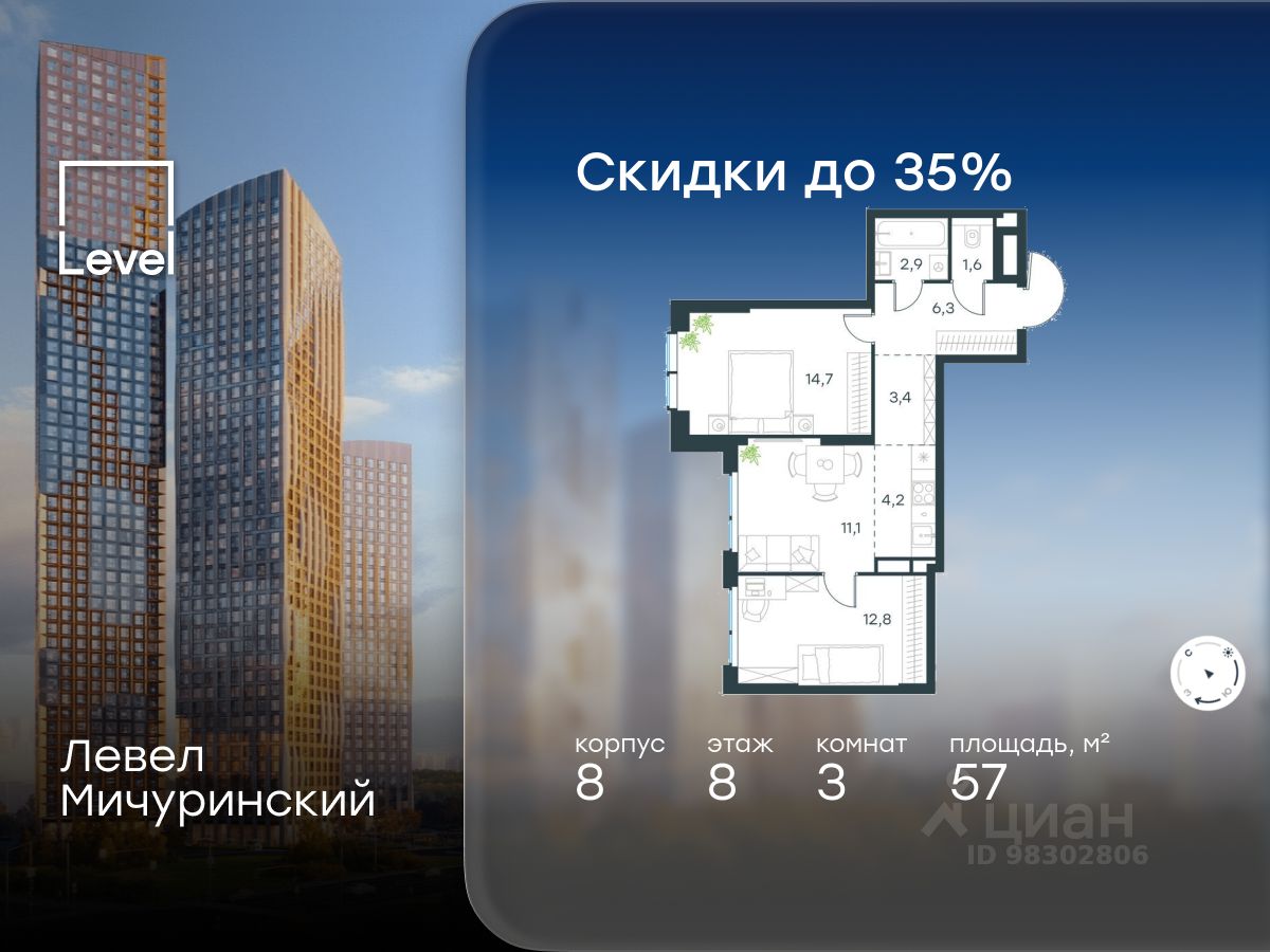В жилом квартале, расположенном на границе с природным заказником "Долина реки Очаковки", продаётся 3-комнатная квартира площадью 57.00 кв.м без отделки. Квартира расположена на 8 этаже 48-этажного корпуса 8 в жилом комплексе бизнес-класса Левел Мичуринский (компания Level Group/Левел групп).
