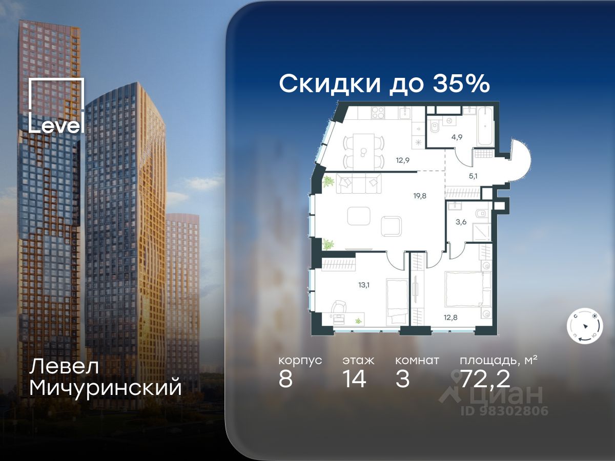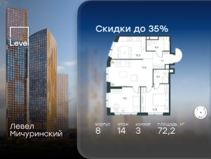 В жилом квартале, расположенном на границе с природным заказником "Долина реки Очаковки", продаётся 3-комнатная квартира площадью 72.20 кв.м без отделки. Квартира расположена на 14 этаже 48-этажного корпуса 8 в жилом комплексе бизнес-класса Левел Мичуринский (компания Level Group/Левел групп).