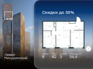 В жилом квартале, расположенном на границе с природным заказником "Долина реки Очаковки", продаётся 3-комнатная квартира площадью 56.40 кв.м без отделки. Квартира расположена на 42 этаже 48-этажного корпуса 8 в жилом комплексе бизнес-класса Левел Мичуринский (компания Level Group/Левел групп).
