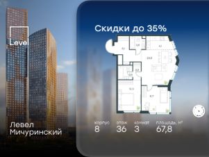 В жилом квартале, расположенном на границе с природным заказником "Долина реки Очаковки", продаётся 3-комнатная квартира площадью 67.80 кв.м без отделки. Квартира расположена на 36 этаже 48-этажного корпуса 8 в жилом комплексе бизнес-класса Левел Мичуринский (компания Level Group/Левел групп).