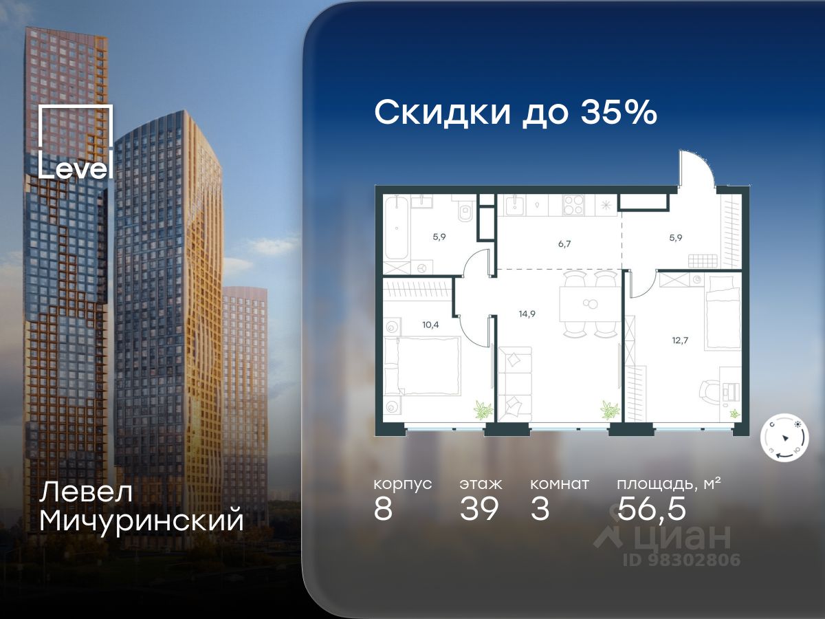 В жилом квартале, расположенном на границе с природным заказником "Долина реки Очаковки", продаётся 3-комнатная квартира площадью 56.50 кв.м без отделки. Квартира расположена на 39 этаже 48-этажного корпуса 8 в жилом комплексе бизнес-класса Левел Мичуринский (компания Level Group/Левел групп).