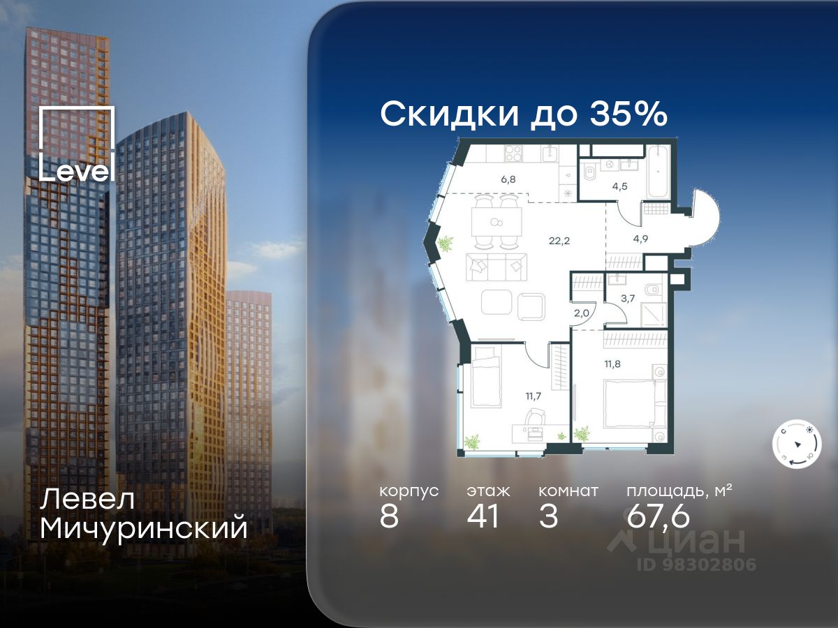 В жилом квартале, расположенном на границе с природным заказником "Долина реки Очаковки", продаётся 3-комнатная квартира площадью 67.60 кв.м без отделки. Квартира расположена на 41 этаже 48-этажного корпуса 8 в жилом комплексе бизнес-класса Левел Мичуринский (компания Level Group/Левел групп).
