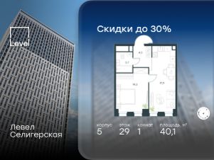 В жилом квартале, расположенном в южной части района Западное Дегунино, продаётся 1-комнатная квартира площадью 40.10 кв.м без отделки. Квартира расположена на 29 этаже 40-этажного корпуса 5 в жилом комплексе комфорт-класса Левел Селигерская (компания Level Group/Левел групп).