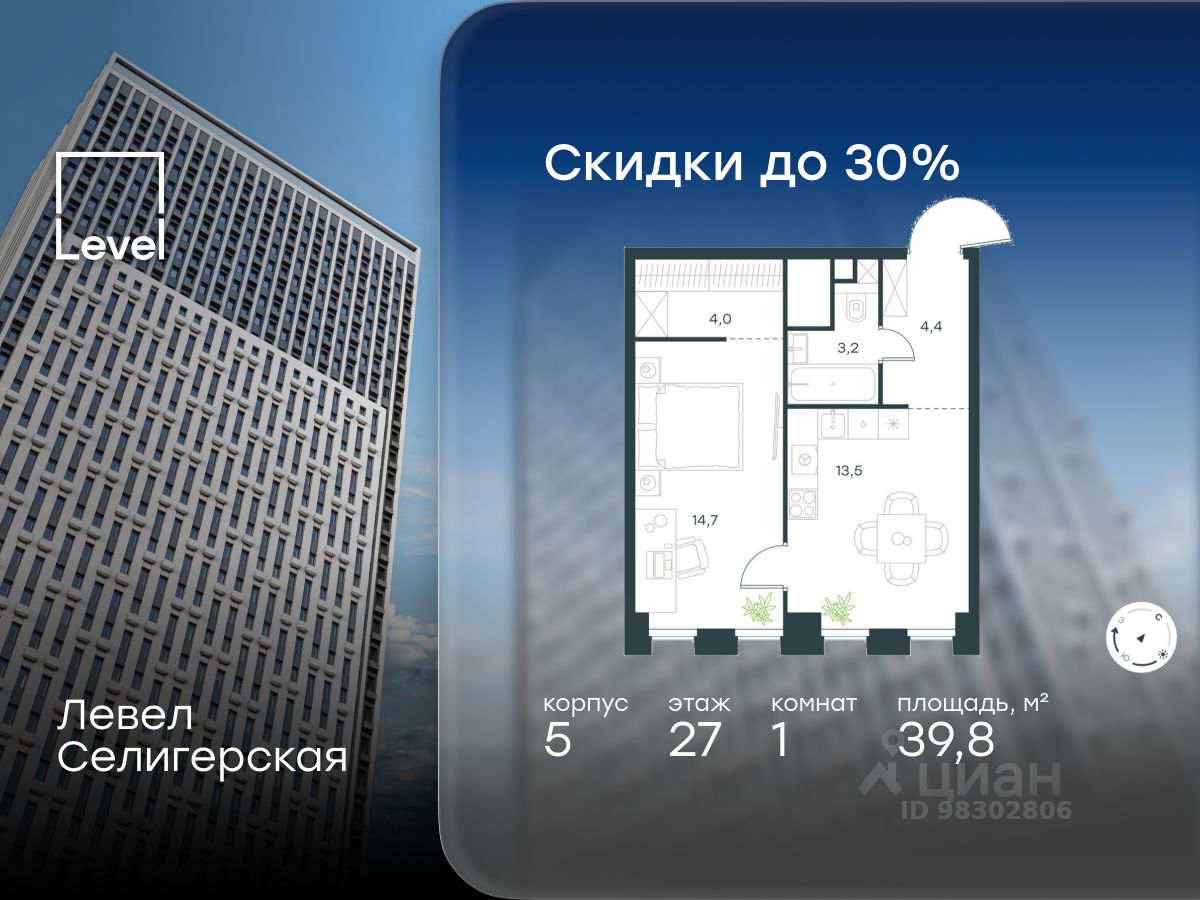 В жилом квартале, расположенном в южной части района Западное Дегунино, продаётся 1-комнатная квартира площадью 39.80 кв.м без отделки. Квартира расположена на 27 этаже 40-этажного корпуса 5 в жилом комплексе комфорт-класса Левел Селигерская (компания Level Group/Левел групп).