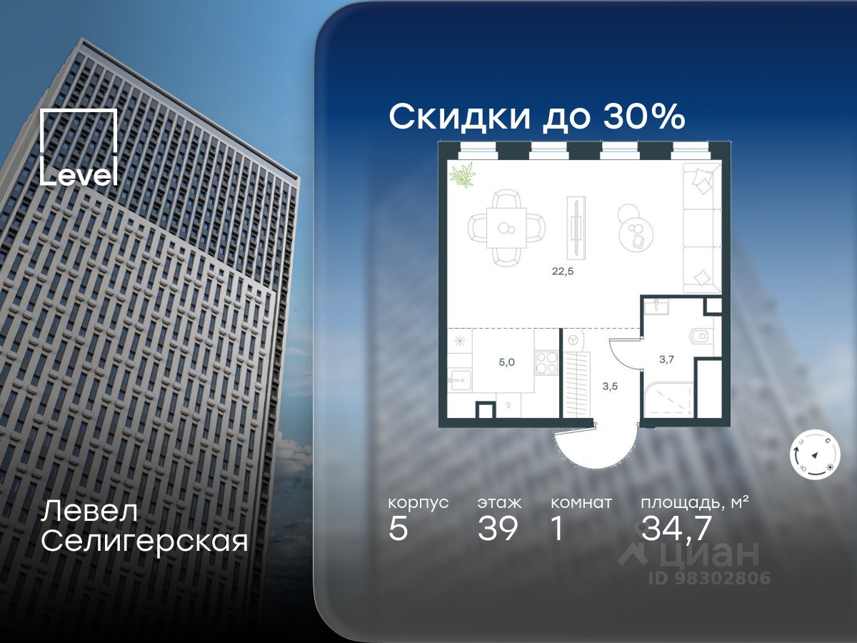 В жилом квартале, расположенном в южной части района Западное Дегунино, продаётся 1-комнатная квартира площадью 34.70 кв.м без отделки. Квартира расположена на 39 этаже 40-этажного корпуса 5 в жилом комплексе комфорт-класса Левел Селигерская (компания Level Group/Левел групп).