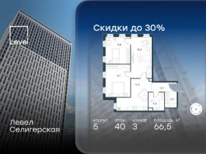 Цена указана с учётом скидки при 100%-й оплате, несубсидированной ипотеке, рассрочке (кроме программы "Рассрочка 0%"). В жилом квартале, расположенном в южной части района Западное Дегунино, продаётся 3-комнатная квартира площадью 66.50 кв.м без отделки. Квартира расположена на 40 этаже 40-этажного корпуса 5 в жилом комплексе комфорт-класса Левел Селигерская (компания Level Group/Левел групп). Отличная транспортная доступность: - 10 мин. пешком до станции метро "Верхние Лихоборы"; - 15 мин. пешком до станции метро "Селигерская"; - 20 мин. пешком до станции МЦД-3 "Моссельмаш"; - 11 мин. на авто до МКАД; - 13 мин. на авто до ТТК; - 16 мин. на авто до Садового кольца. Расположение Район отличается богатой социальной инфраструктурой: школы, детские сады, поликлиники, магазины, фитнес-клубы, торговые центры - всё близко к дому. Рядом с Левел Селигерская расположено 5 парковых зон. В 3 минутах от дома расположен перспективный сквер-парк. В 10 минутах пешком находится парк им. Святослава Фёдорова, в 13 минутах на велосипеде - парк "Ангарские пруды". В 7-11 минутах на автомобиле - два крупных природных объекта: Тимирязевский парк и Главный ботанический сад Российской академии наук. Благоустройство Внутренние дворы жилого комплекса огорожены от машин, а их функциональное наполнение отличается в зависимости от очереди строительства. На территории 2-й очереди жителей ждут уютные навесы с качелями, павильон-читальня, волейбольная площадка, беседки, а также детские и спортивные площадки. Технологии и инженерия Для входа на территорию комплекса предусмотрен единый ключ доступа. Все общественные зоны оснащены камерами видеонаблюдения, по заявке собственнику предоставляется возможность просмотра изображения отдельных видеокамер на его мобильном устройстве. При въезде в паркинг функционирует система распознавания госномеров. Кроме того, для комфорта жителей создано мобильное приложение, с помощью которого можно удаленно контролировать доступ на придомовую и жилую территории. Другие преимущества жилого комплекса - Высокая освещённость квартир: в большинстве из них не менее трёх окон; - Супермаркет, магазины, кафе, пекарни и многое другое на первых этажах домов; - Частный детский сад; - Стильные дизайнерские лобби с высокими потолками до 4,3 м. и окнами в пол, для питомцев предусмотрена лапомойка; - 30+ планировочных решений: от компактных студий до просторных семейных квартир; - С каждого этажа дома на лифте можно спуститься в подземный отапливаемый паркинг."