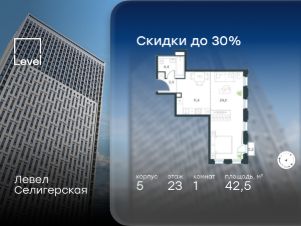 В жилом квартале, расположенном в южной части района Западное Дегунино, продаётся 1-комнатная квартира площадью 42.50 кв.м без отделки. Квартира расположена на 23 этаже 40-этажного корпуса 5 в жилом комплексе комфорт-класса Левел Селигерская (компания Level Group/Левел групп).