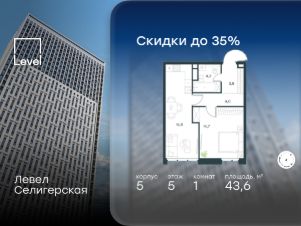 В жилом квартале, расположенном в южной части района Западное Дегунино, продаётся 1-комнатная квартира площадью 43.60 кв.м без отделки. Квартира расположена на 5 этаже 40-этажного корпуса 5 в жилом комплексе комфорт-класса Левел Селигерская (компания Level Group/Левел групп).