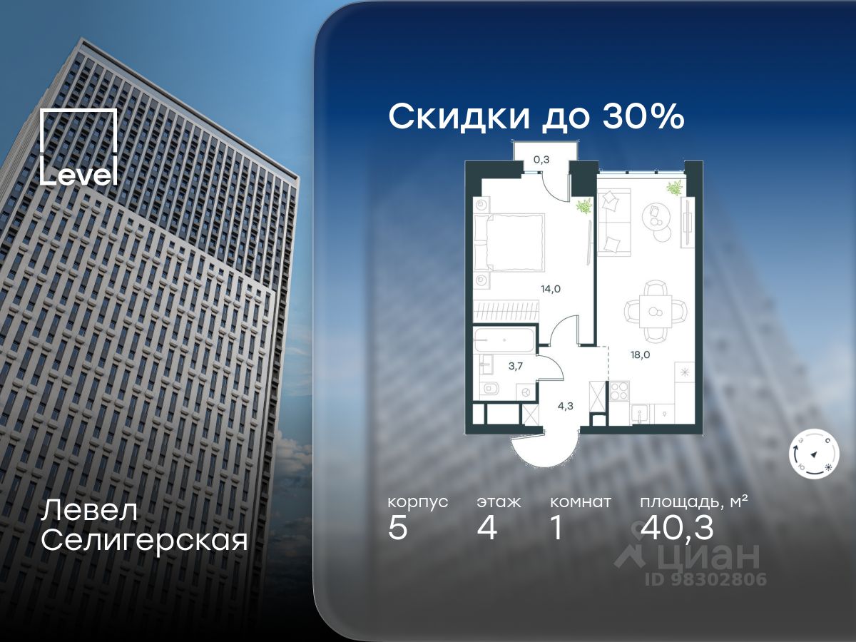 В жилом квартале, расположенном в южной части района Западное Дегунино, продаётся 1-комнатная квартира площадью 40.30 кв.м без отделки. Квартира расположена на 4 этаже 40-этажного корпуса 5 в жилом комплексе комфорт-класса Левел Селигерская (компания Level Group/Левел групп).