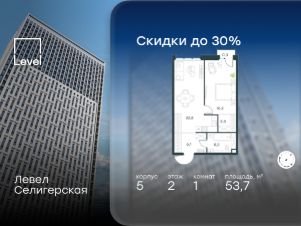 В жилом квартале, расположенном в южной части района Западное Дегунино, продаётся 1-комнатная квартира площадью 53.70 кв.м без отделки. Квартира расположена на 2 этаже 40-этажного корпуса 5 в жилом комплексе комфорт-класса Левел Селигерская (компания Level Group/Левел групп).