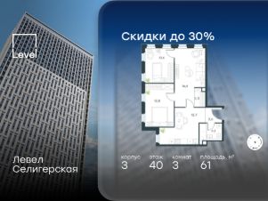 В жилом квартале, расположенном в южной части района Западное Дегунино, продаётся 3-комнатная квартира площадью 61.00 кв.м без отделки. Квартира расположена на 40 этаже 40-этажного корпуса 3 в жилом комплексе комфорт-класса Левел Селигерская (компания Level Group/Левел групп).