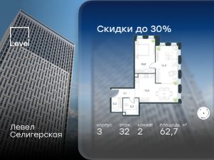 В жилом квартале, расположенном в южной части района Западное Дегунино, продаётся 2-комнатная квартира площадью 62.70 кв.м без отделки. Квартира расположена на 32 этаже 40-этажного корпуса 3 в жилом комплексе комфорт-класса Левел Селигерская (компания Level Group/Левел групп).