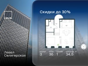 В жилом квартале, расположенном в южной части района Западное Дегунино, продаётся 1-комнатная квартира площадью 34.50 кв.м без отделки. Квартира расположена на 36 этаже 40-этажного корпуса 3 в жилом комплексе комфорт-класса Левел Селигерская (компания Level Group/Левел групп).