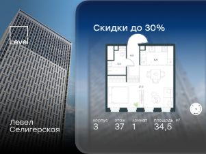 Цена указана с учётом скидки при 100%-й оплате, несубсидированной ипотеке, рассрочке (кроме программы "Рассрочка 0%"). В жилом квартале, расположенном в южной части района Западное Дегунино, продаётся 1-комнатная квартира площадью 34.50 кв.м без отделки. Квартира расположена на 37 этаже 40-этажного корпуса 3 в жилом комплексе комфорт-класса Левел Селигерская (компания Level Group/Левел групп). Отличная транспортная доступность: - 10 мин. пешком до станции метро "Верхние Лихоборы"; - 15 мин. пешком до станции метро "Селигерская"; - 20 мин. пешком до станции МЦД-3 "Моссельмаш"; - 11 мин. на авто до МКАД; - 13 мин. на авто до ТТК; - 16 мин. на авто до Садового кольца. Расположение Район отличается богатой социальной инфраструктурой: школы, детские сады, поликлиники, магазины, фитнес-клубы, торговые центры - всё близко к дому. Рядом с Левел Селигерская расположено 5 парковых зон. В 3 минутах от дома расположен перспективный сквер-парк. В 10 минутах пешком находится парк им. Святослава Фёдорова, в 13 минутах на велосипеде - парк "Ангарские пруды". В 7-11 минутах на автомобиле - два крупных природных объекта: Тимирязевский парк и Главный ботанический сад Российской академии наук. Благоустройство Внутренние дворы жилого комплекса огорожены от машин, а их функциональное наполнение отличается в зависимости от очереди строительства. На территории 2-й очереди жителей ждут уютные навесы с качелями, павильон-читальня, волейбольная площадка, беседки, а также детские и спортивные площадки. Технологии и инженерия Для входа на территорию комплекса предусмотрен единый ключ доступа. Все общественные зоны оснащены камерами видеонаблюдения, по заявке собственнику предоставляется возможность просмотра изображения отдельных видеокамер на его мобильном устройстве. При въезде в паркинг функционирует система распознавания госномеров. Кроме того, для комфорта жителей создано мобильное приложение, с помощью которого можно удаленно контролировать доступ на придомовую и жилую территории. Другие преимущества жилого комплекса - Высокая освещённость квартир: в большинстве из них не менее трёх окон; - Супермаркет, магазины, кафе, пекарни и многое другое на первых этажах домов; - Частный детский сад; - Стильные дизайнерские лобби с высокими потолками до 4,3 м. и окнами в пол, для питомцев предусмотрена лапомойка; - 30+ планировочных решений: от компактных студий до просторных семейных квартир; - С каждого этажа дома на лифте можно спуститься в подземный отапливаемый паркинг."