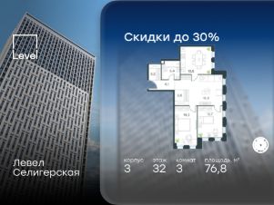 В жилом квартале, расположенном в южной части района Западное Дегунино, продаётся 3-комнатная квартира площадью 76.80 кв.м без отделки. Квартира расположена на 32 этаже 40-этажного корпуса 3 в жилом комплексе комфорт-класса Левел Селигерская (компания Level Group/Левел групп).