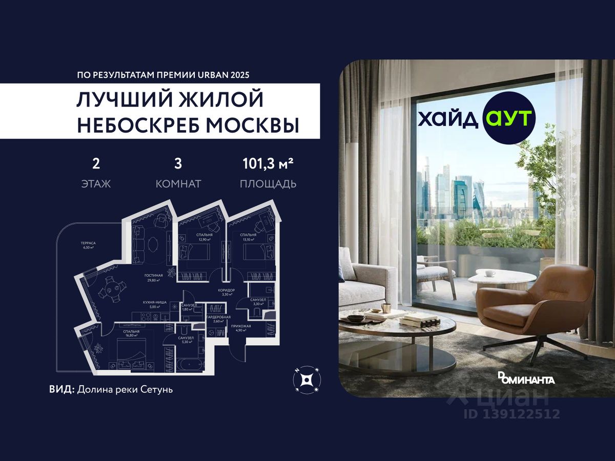 Прямая продажа от застройщика! Продается 3-комнатная квартира площадью 101.3 кв.м. на 2-м этаже 34-этажного дома в жилом комплексе ХАЙДАУТ с панорамными видами: Парк Победы, Долина реки Сетунь, Москва-сити. Высота потолков 3,25 м. В проекте действуют привлекательные условия покупки: скидка до 15% при рассрочке 0% на 1,5 года или при оплате одним платежом (в том числе ипотека). Предложение действует до 31.03.2026.