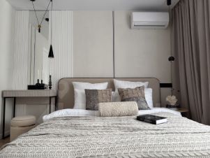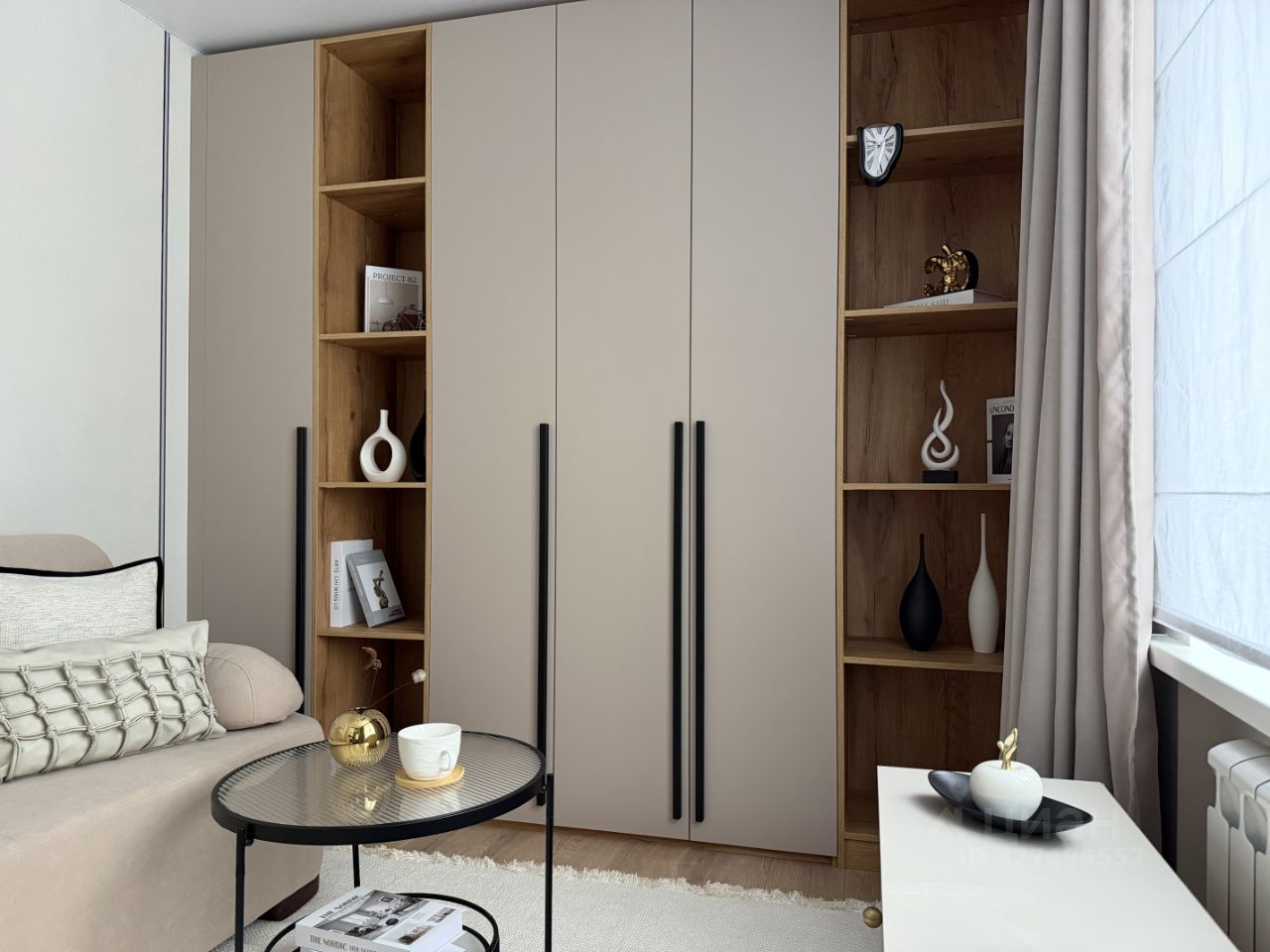 В квартире предусмотрено много мест хранения, включая кровать с подъемным механизмом.