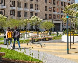 Все корпуса в квартале гармонично сочетаются, образуя единую городскую среду. Между собой их объединяет невысокая этажность и натуральная цветовая гамма. Здесь приятно гулять и проводить время на улице всей семьёй.