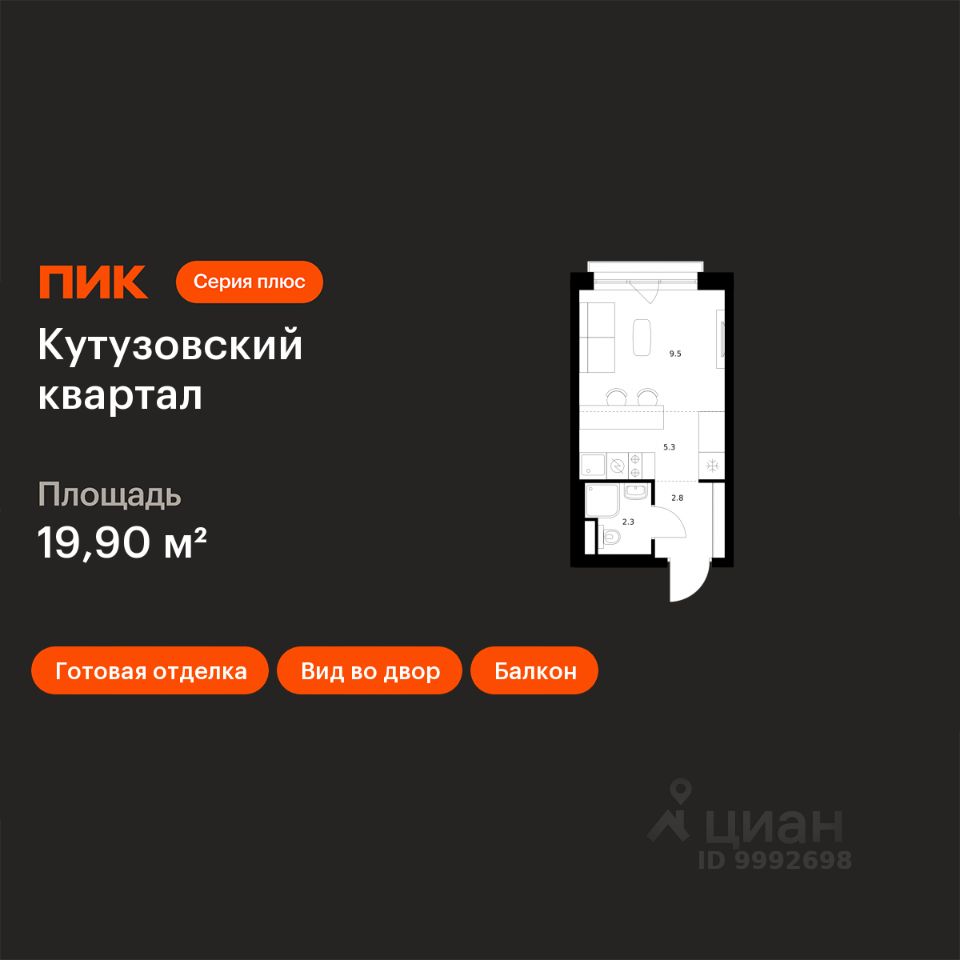 Продаётся квартира-студия площадью 19,9 кв.м на 3 этаже 30 этажного дома (Корпус 3, Секция 2) проекта ПИК Кутузовский квартал. Светлый просторный подъезд на уровне земли, функциональная планировка, большие окна, c отделкой.