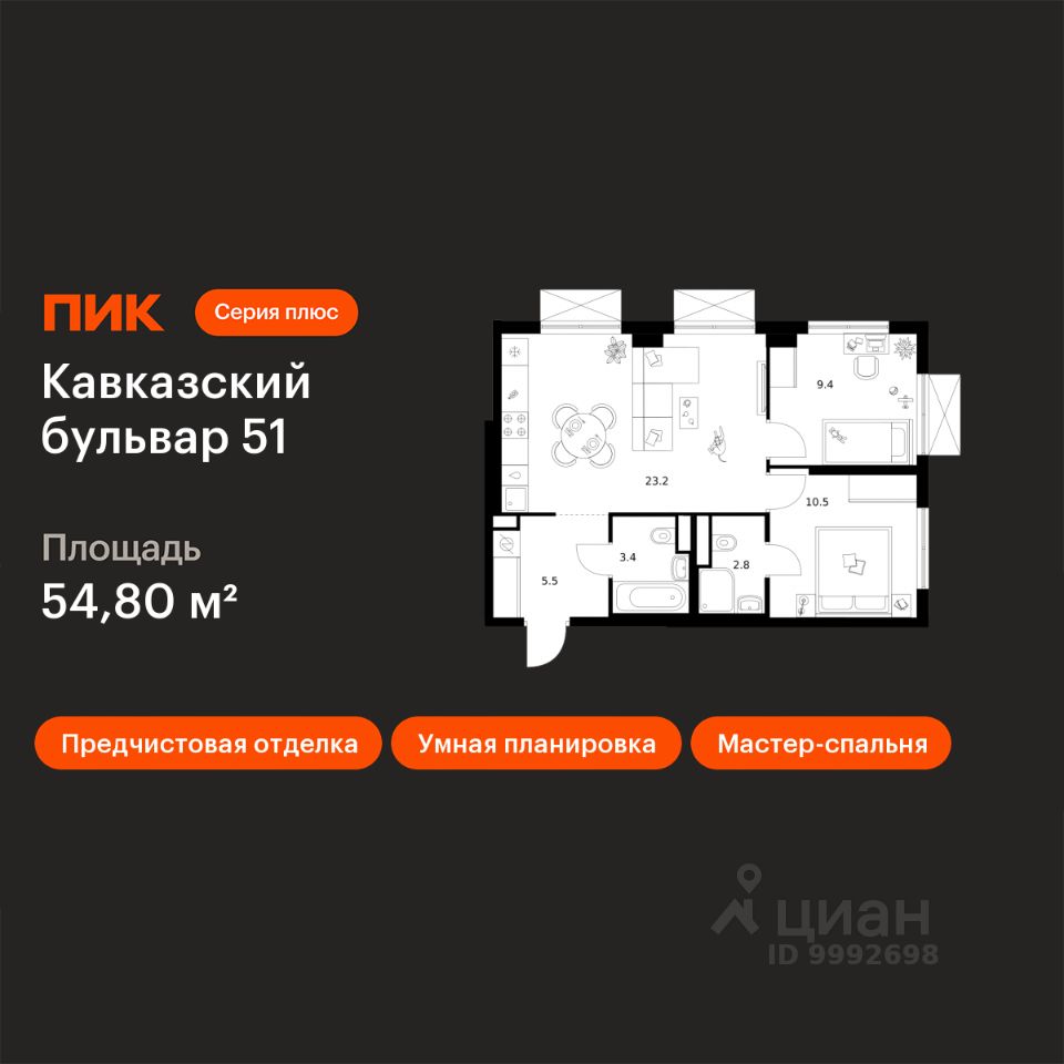 Продаётся 2-комн. квартира площадью 54,8 кв.м на 18 этаже 24 этажного дома (Корпус 3.5, Секция 2) проекта ПИК Кавказский бульвар 51. Светлый просторный подъезд на уровне земли, функциональная планировка, большие окна, предчистовая отделка.