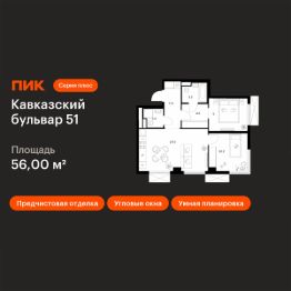 Продаётся 2-комн. квартира площадью 56 кв.м на 21 этаже 24 этажного дома (Корпус 3.5, Секция 2) проекта ПИК Кавказский бульвар 51. Светлый просторный подъезд на уровне земли, функциональная планировка, большие окна, предчистовая отделка.