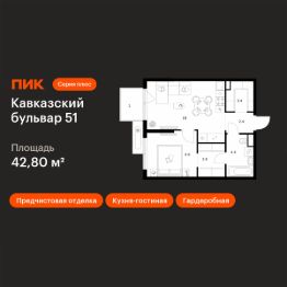 Продаётся 1-комн. квартира площадью 42,8 кв.м на 13 этаже 24 этажного дома (Корпус 3.5, Секция 2) проекта ПИК Кавказский бульвар 51. Светлый просторный подъезд на уровне земли, функциональная планировка, большие окна, предчистовая отделка.