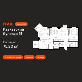 Продаётся 3-комн. квартира площадью 75,2 кв.м на 9 этаже 23 этажного дома (Корпус 3.2, Секция 2) проекта ПИК Кавказский бульвар 51. Светлый просторный подъезд на уровне земли, функциональная планировка, большие окна, c отделкой.