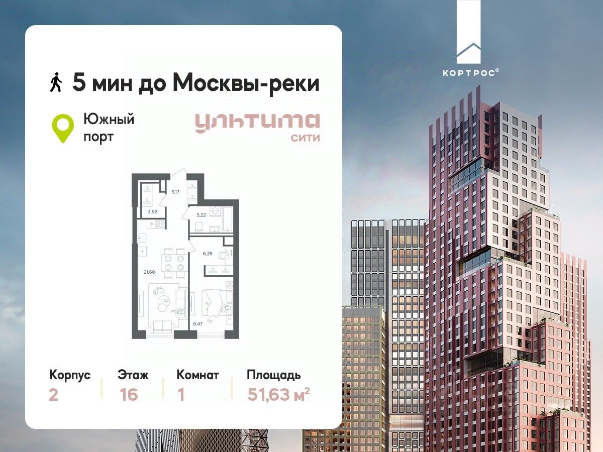 Продаётся 1-комнатная квартира от застройщика ГК "КОРТРОС" в жилом комплексе бизнес-класса УЛЬТИМА Сити. Квартира расположена на 16 этаже 52 этажного корпуса 2. Общая площадь 51,63 м². Без отделки.
