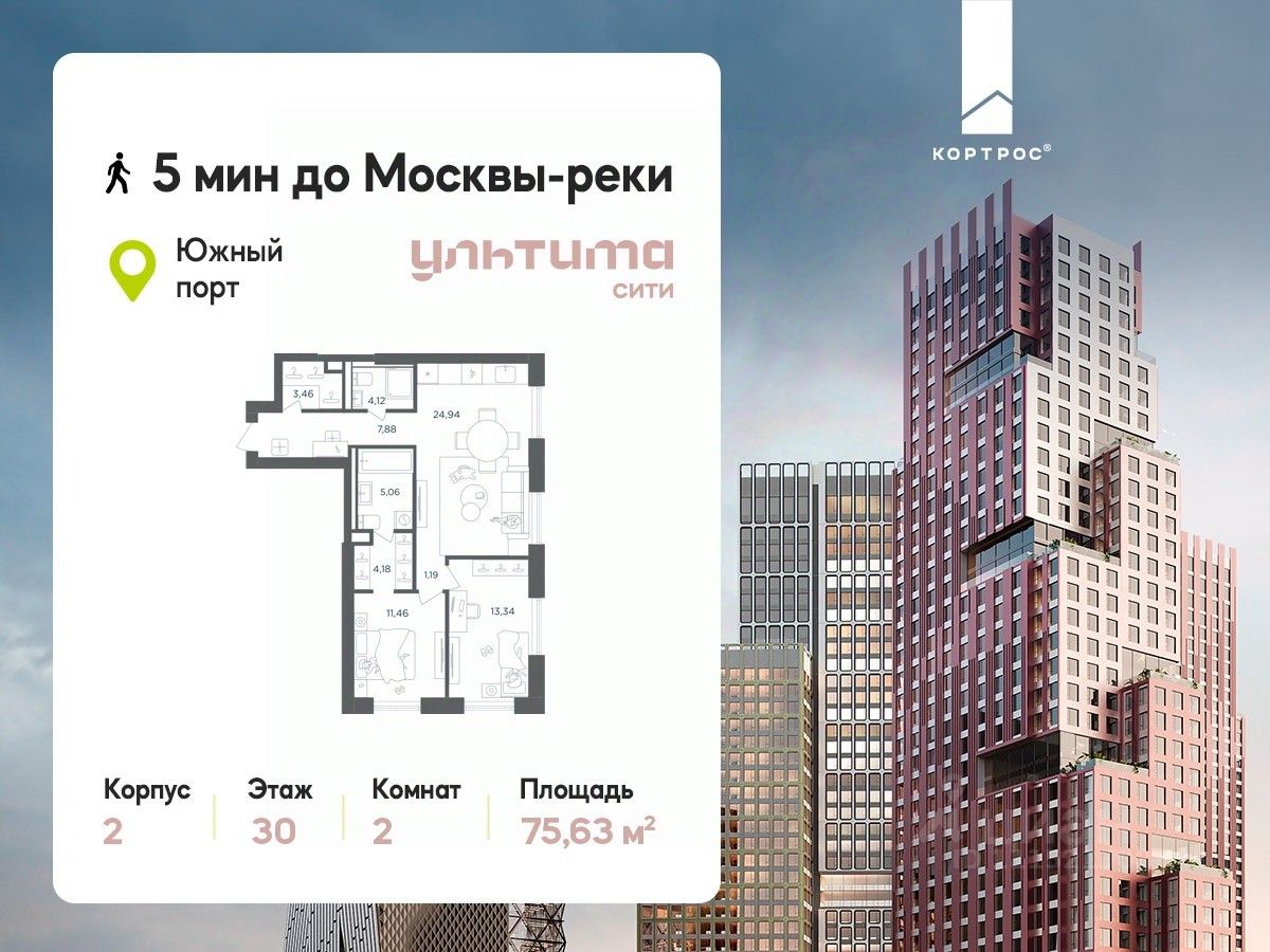 Продаётся 2-комнатная квартира от застройщика ГК "КОРТРОС" в жилом комплексе бизнес-класса УЛЬТИМА Сити. Квартира расположена на 30 этаже 52 этажного корпуса 2. Общая площадь 75,63 м². Без отделки.