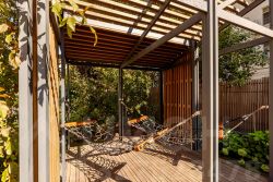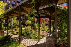 Особое внимание уделено функциональности двора. Здесь разместились детская площадка, зона детского сада, многофункциональная спортивная площадка, множество лавочек, беседок и декоративных навесов.
