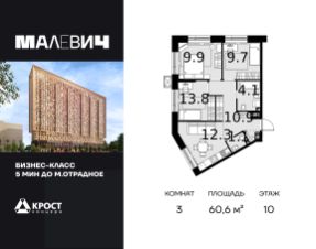Продаётся 3-к квартира 60.6 кв.м. на 10-м этаже 28 этажного дома.