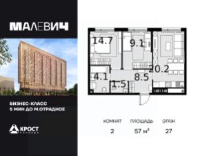 Продаётся 2-к квартира 57 кв.м. на 27-м этаже 28 этажного дома.