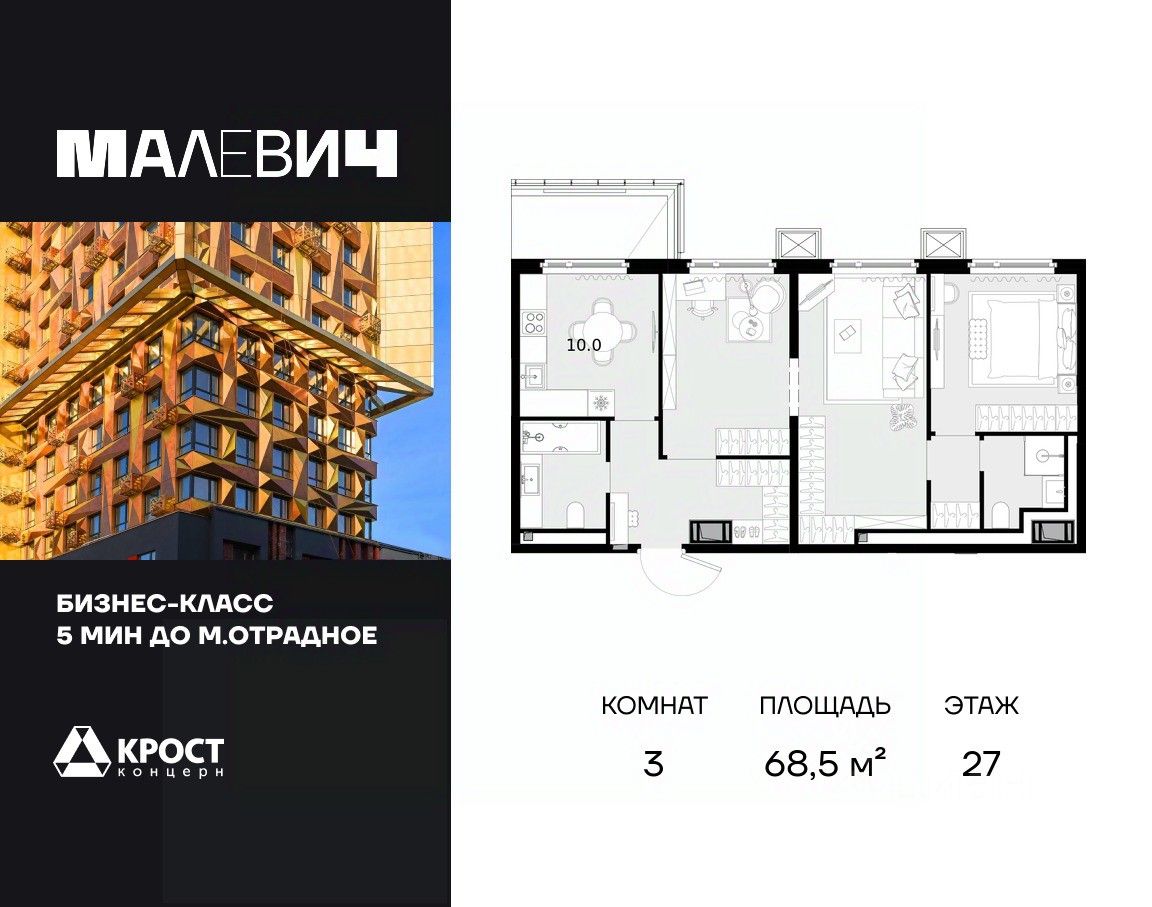 Продаётся 3-к квартира 68.5 кв.м. на 27-м этаже 28 этажного дома.