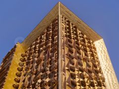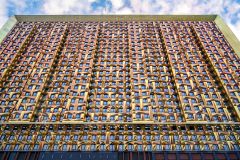 Здание состоит из двух объемов, один из которых сдвинут относительного другого в горизонтальной плоскости.