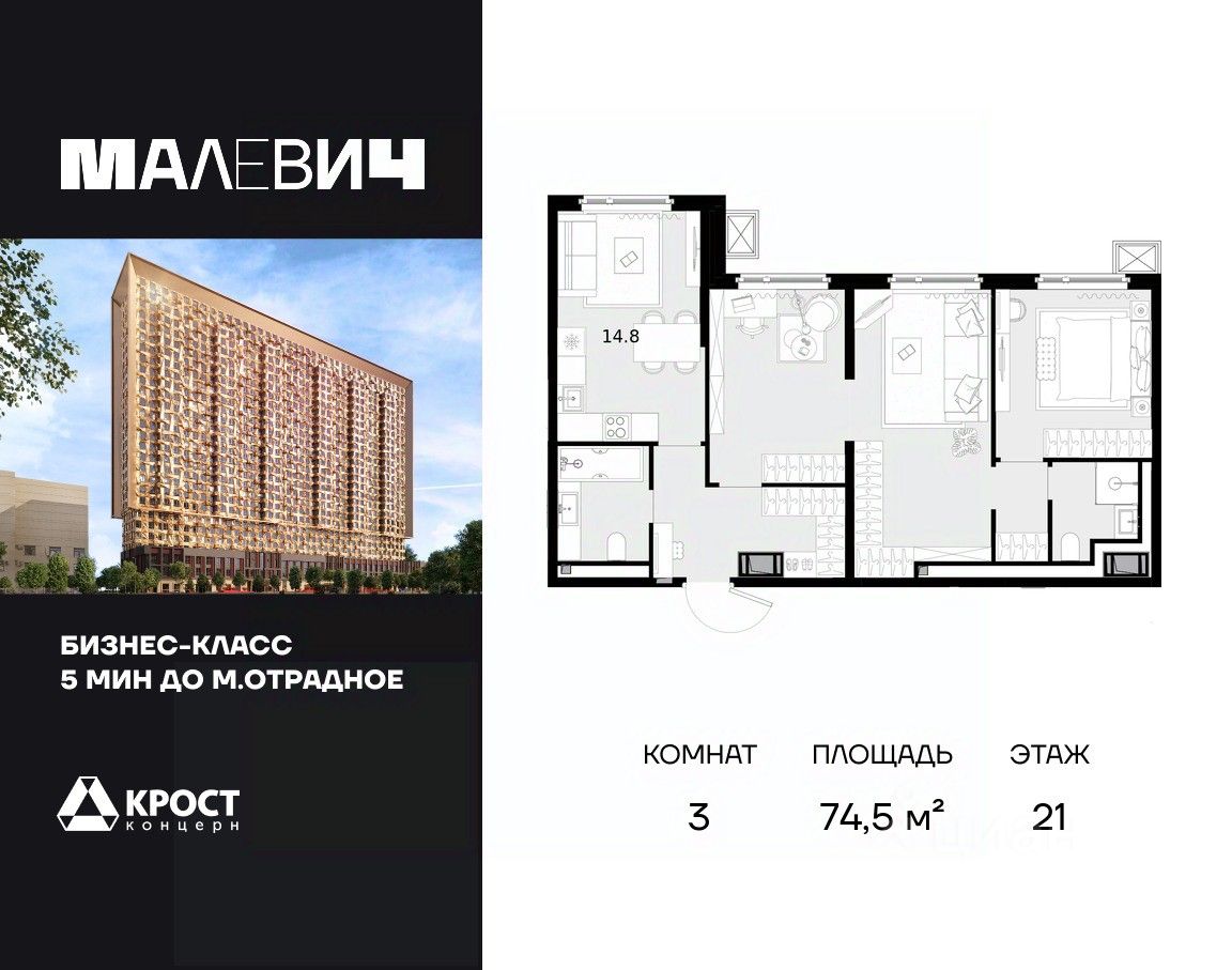 Продаётся 3-к квартира 73.3 кв.м. на 21-м этаже 28 этажного дома.