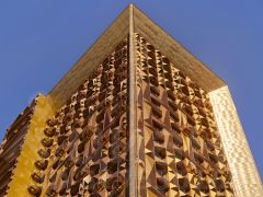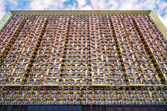 Здание состоит из двух объемов, один из которых сдвинут относительного другого в горизонтальной плоскости.